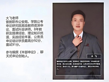 大飞老师曾就职市公安局。学院公考申论研究院高级教师资深申论、面试科目讲师。8年教研及授课经验,理论知识优渥,实战经验丰富。